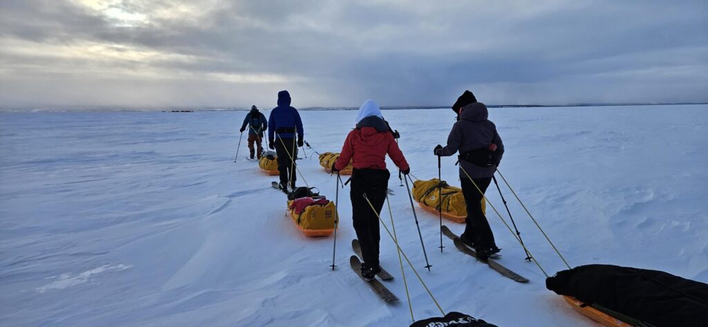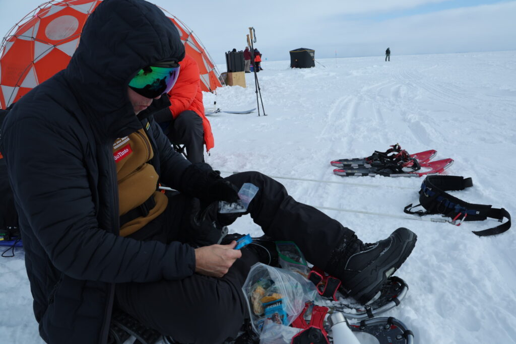 On voit différents changements chez nos participants : on a appris de nos erreurs de la veille. On réajuste des couches pour ne pas transpirer dans les 15 premières minutes et être trempé pour le restant de la journée, on échange skis et raquettes pour certains, on prend le temps de boire et de manger davantage. On dirait que le plus difficile est passé et qu’aujourd’hui, on peut enfin entendre ce dont notre corps a besoin.