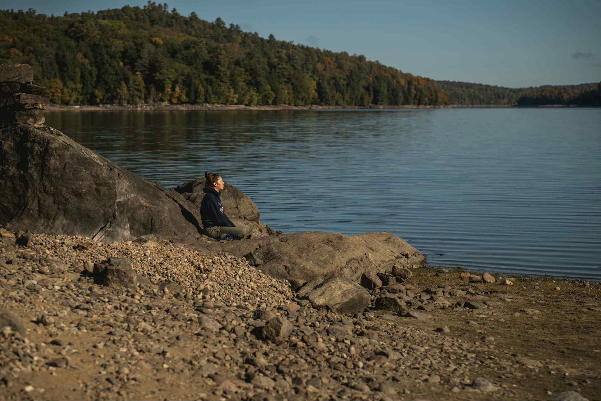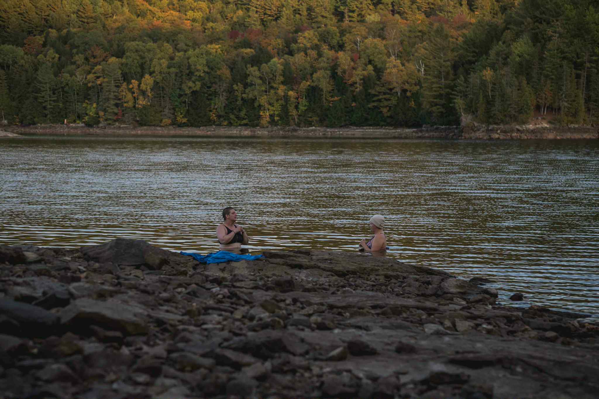 Après quelques km, on s’arrête sur l’île à la roche (nom non officiel). On prend un moment pour ouvrir notre cercle et notre cœur à nouveau. Les participantes échangent, Katherine commence. Elles partagent ce qui les a aidées dans leur parcours avec le cancer et ce qu’elles aimeraient mettre en place pour la suite de leur cheminement. La discussion est inspirante et émouvante. Elles abordent le pouvoir de la gratitude, les 5 C, l’importance de se concentrer sur ce qu’il reste, la patience (du lichen) et aussi le droit d’être en colère. Elles nomment comment cette expédition est un point tournant pour elles. Je me sens privilégiée d’être ici, de les écouter, d’être témoin de la résilience qui les porte. Je suis aussi touchée par la façon dont elles sont fortes oui, mais surtout vulnérables et vraies.