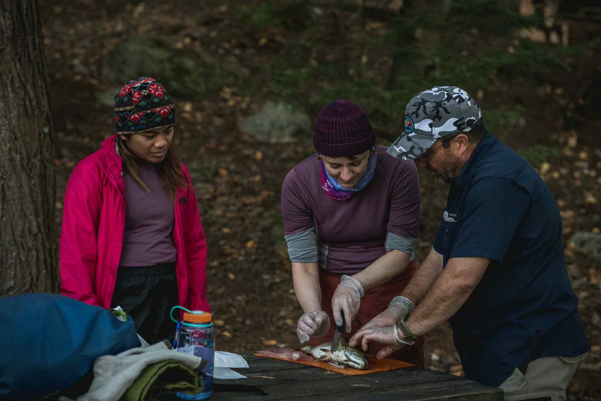 J’observe le groupe pendant que je vous écris. Amy et Liz apprennent à faire des filets et à apprêter des achigans qu’on s’est fait donner par des pêcheurs.