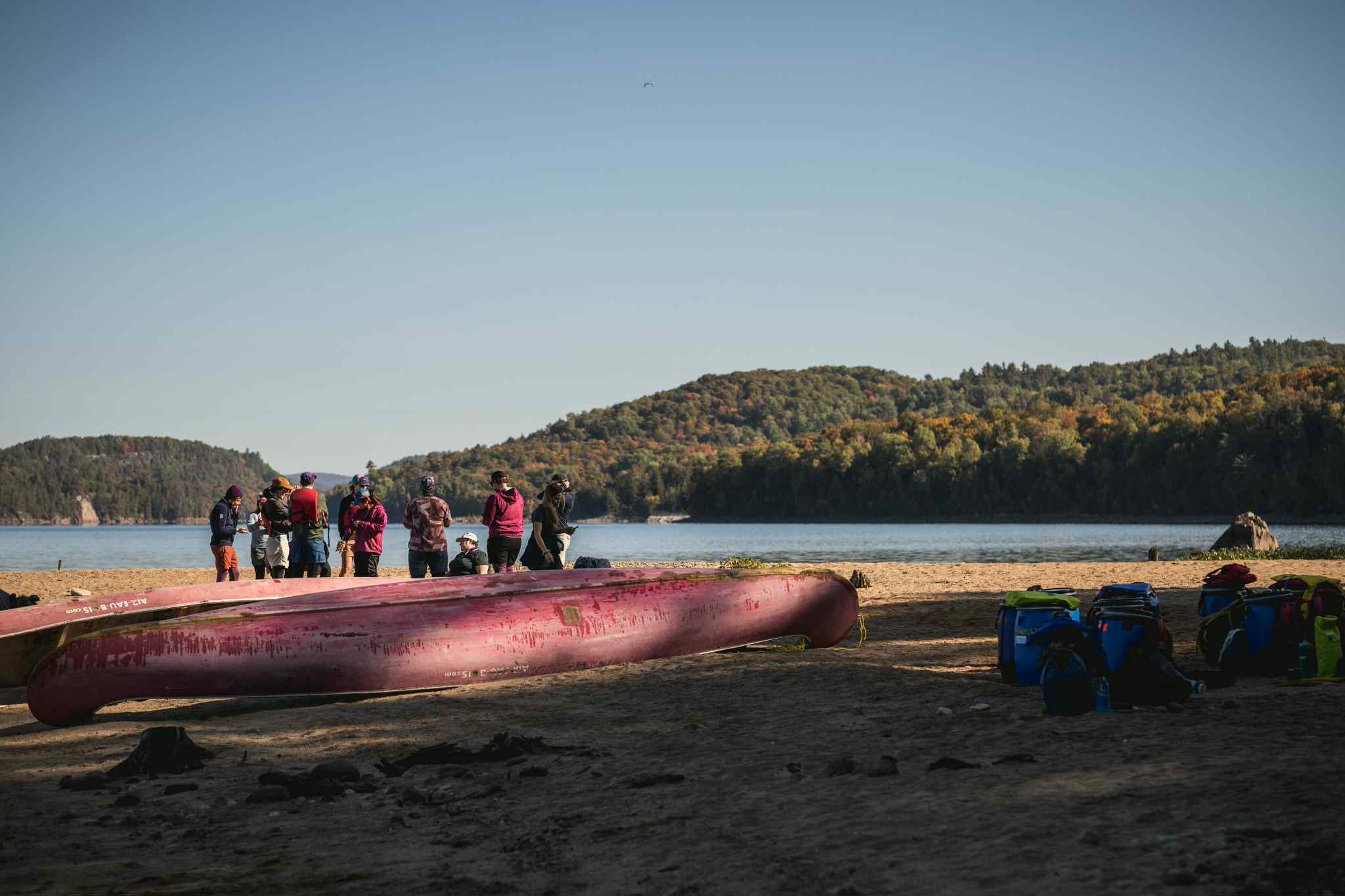 Il nous reste 5 km de rabaska à faire. Le vent est fort et la fatigue est présente. Tout le monde travaille en équipe. On alterne les pauses, on longe la rive comme on peut. Les émotions et les ressentis s’intensifient. On s’entraide, on collabore et finalement, on arrive à notre deuxième campement.