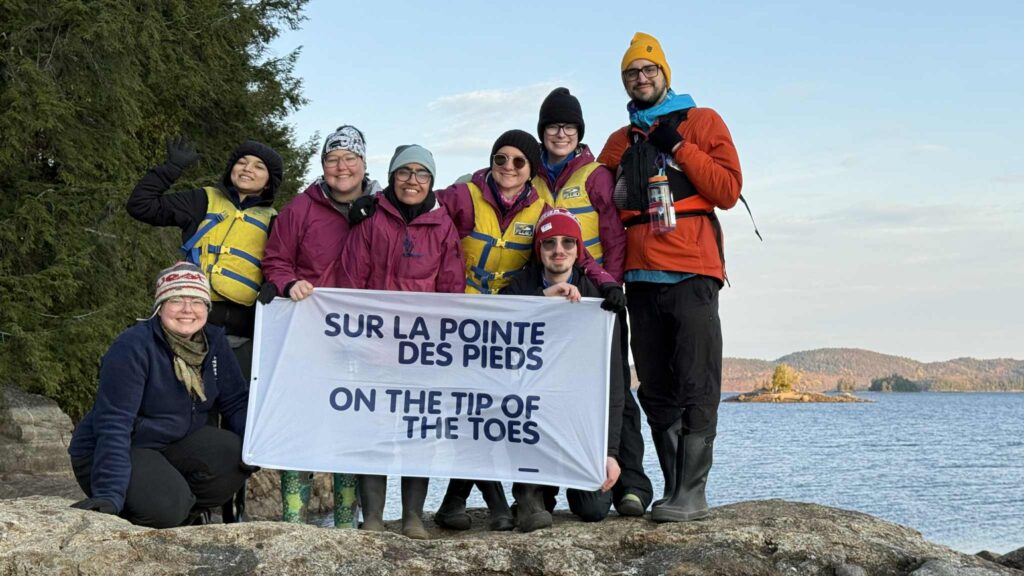 Peu après le déjeuner, nous avons repris place dans les rabaskas pour les derniers coups de pagaie sur le réservoir. Chaque mouvement semblait plus lent, plus conscient, plus posé, comme si tout prenait son sens à l’approche de la terre ferme. Comme si les participants laissaient derrière eux tout ce qui n’était plus nécessaire pour continuer d’avancer. Comme si le désir de poursuivre plus légers avait émergé à travers ce défi relevé.