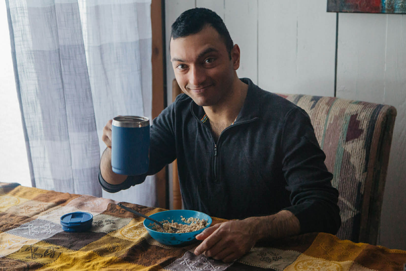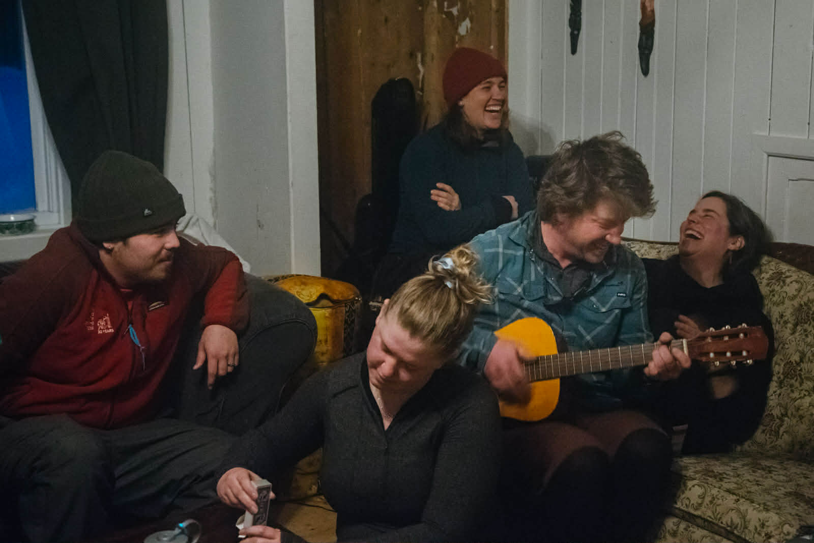 Comme tous les matins, c’est Catherine et son ukulélé qui assurent le réveil en douceur. La chanson du jour? Une version de Gens du pays spécialement adaptée pour la fête de Kiran, qui célèbre ses 28 ans aujourd’hui même! (Je garde la surprise du gâteau d’anniversaire pour le blogue de demain.) La maison de Simon regorge d’instruments, de la guitare au banjo en passant par diverses percussions. Et ça tombe bien, le groupe est aussi riche en musiciens et chanteurs. L’animation des veillées est donc assurée grâce à deux épais cahiers de chansons que Catherine transporte toujours avec elle. Hier soir, entre deux chansons reprises en chœur, Mario nous a conté l’histoire de la fondation Sur la pointe des pieds, fondée en 1996 avec l’oncologue Sylvain Baruchel lors d’une expédition inaugurale dans les monts Groulx. Quand Mario conte, il y a beaucoup d’épiques digressions et de riches anecdotes, et l’auditoire, vingt personnes amassées dans le salon de Simon, reste captivé.