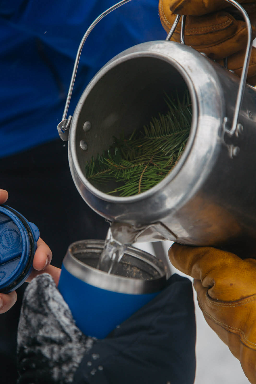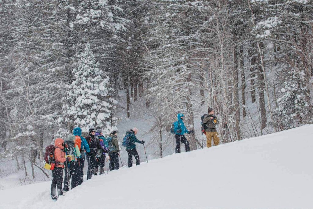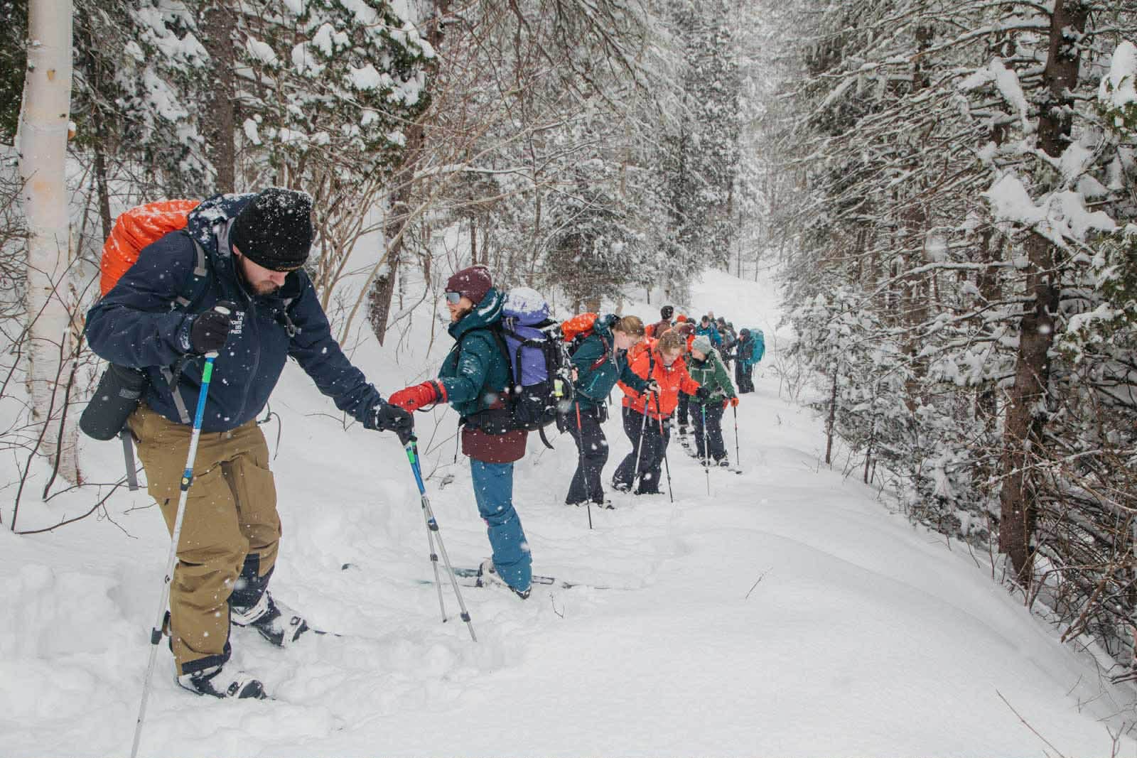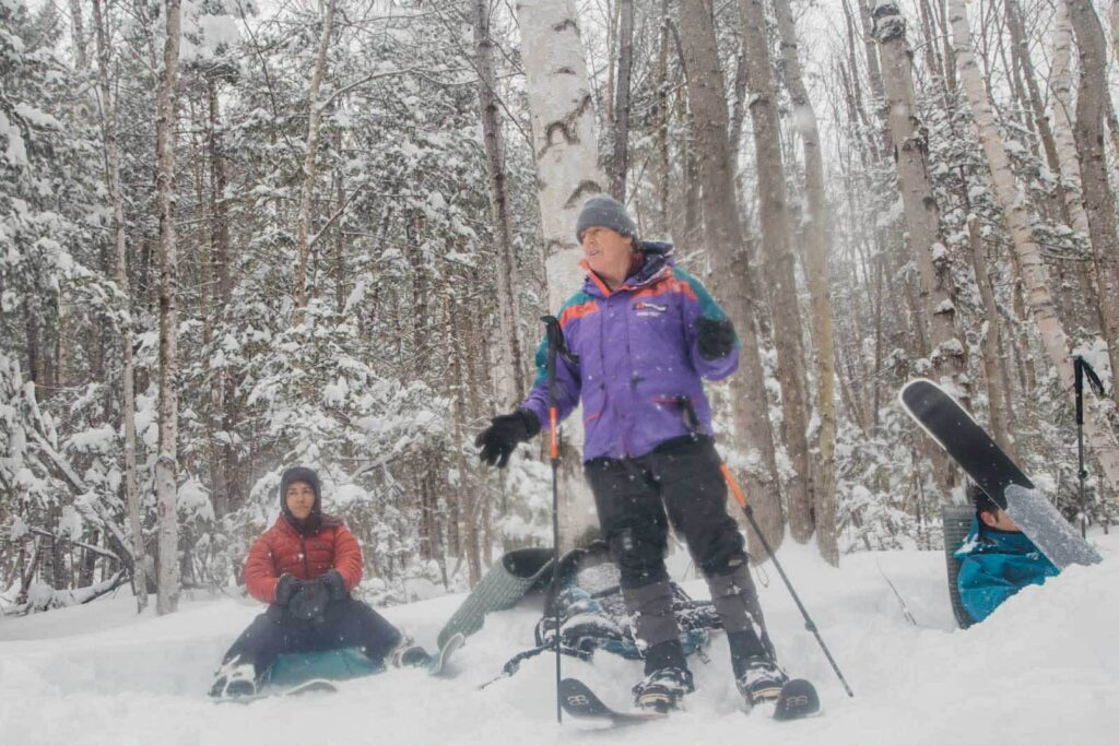 Encore une fois, c’est notre guide, l’infatigable Simon, qui nous a offert une de nos plus belles journées en nous donnant accès à la forêt de son immense terre. C’est toujours chaussés de nos skis-hoks que nous attaquons une heure de montée en zigzag dans l’épaisse forêt de bouleaux. Il faut se relayer en tête pour ouvrir la route à la longue file de skieurs qui suit. Toute la stratégie consiste à ne pas transpirer pour éviter de tremper ses vêtements. Il s’agit donc de mesurer sa cadence, de prendre assez de pauses, de retirer ses couches de vêtements ou d’en ouvrir les aérations.