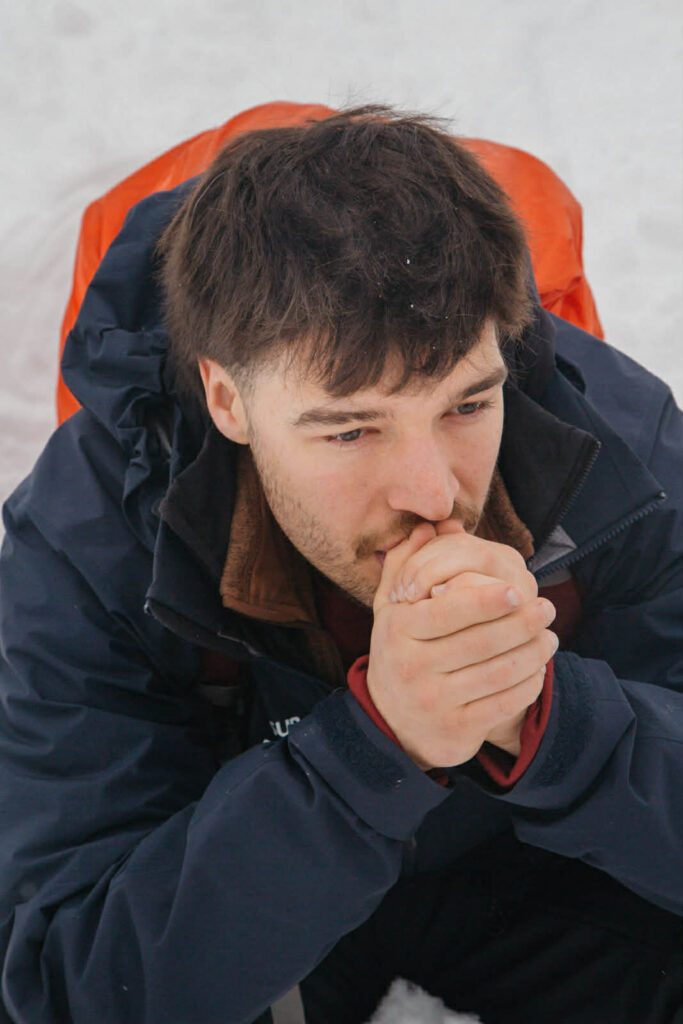 Et ce matin, c’est à nouveau Mario que nous suivions alors qu’il ouvre notre route dans la neige fraîche à grandes enjambées de ski-hok. Alors vous le savez déjà, mais la tempête cataclysmique annoncée n’a pas eu lieu. Nous aurions sans doute pu rester dans la forêt, mais les expéditions de plein air s’accommodent mal des «sans doute». Mieux vaut prévenir que guérir. En échange de notre prévoyance, nous avons été récompensés par 30 cm de neige parfaite et une température des plus clémentes.