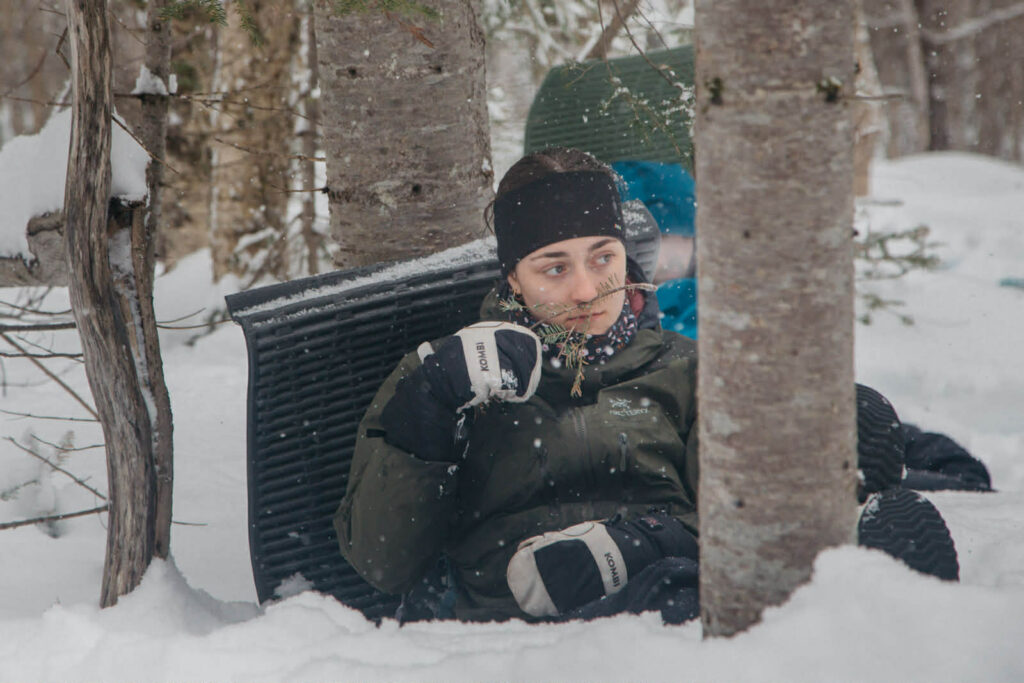 Une fois au sommet, chacun s’installe dans la neige : qui étendu sur un tapis de sol, qui adossé à un arbre. Mario et Marie-Michèle nous proposent une activité de pleine conscience au cœur de la forêt. En premier lieu, il s’agit de respirer profondément, puis nous nous concentrons tour à tour sur un sens à la fois. Le son d’abord, comme celui de la neige qui tombe, note Sierra. Puis vient la vue. «On prête attention à ce qui bouge, comme le vent dans les branches», propose Camille. Suit l’odeur, le plus puissant catalyseur de souvenirs, estime Mario. Celle du sapin «m’a tout de suite replongé dans un camp d’été de mon enfance», se réjouit Annie-Rose. «C’est important de se concentrer aussi sur les petits détails», conclut Mario.